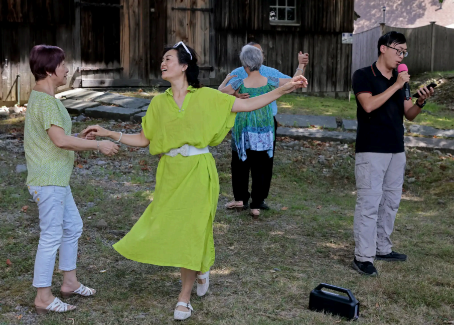 May Wong (left) and May Feng danced as Anson Sun sang to the crowd on the grounds of the Braintree Historical